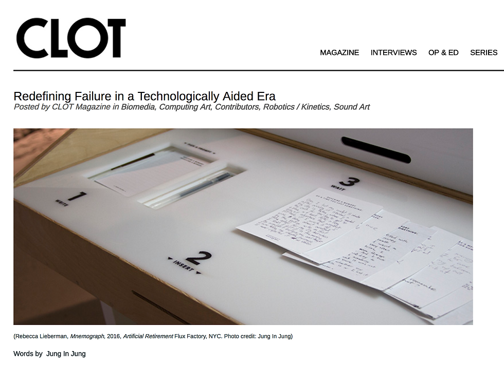 Wrote an article based on my curatorial project, Artificial Retirement, at Flux Factory in 2016. Read the article here: http://www.clotmag.com/redefining-failure